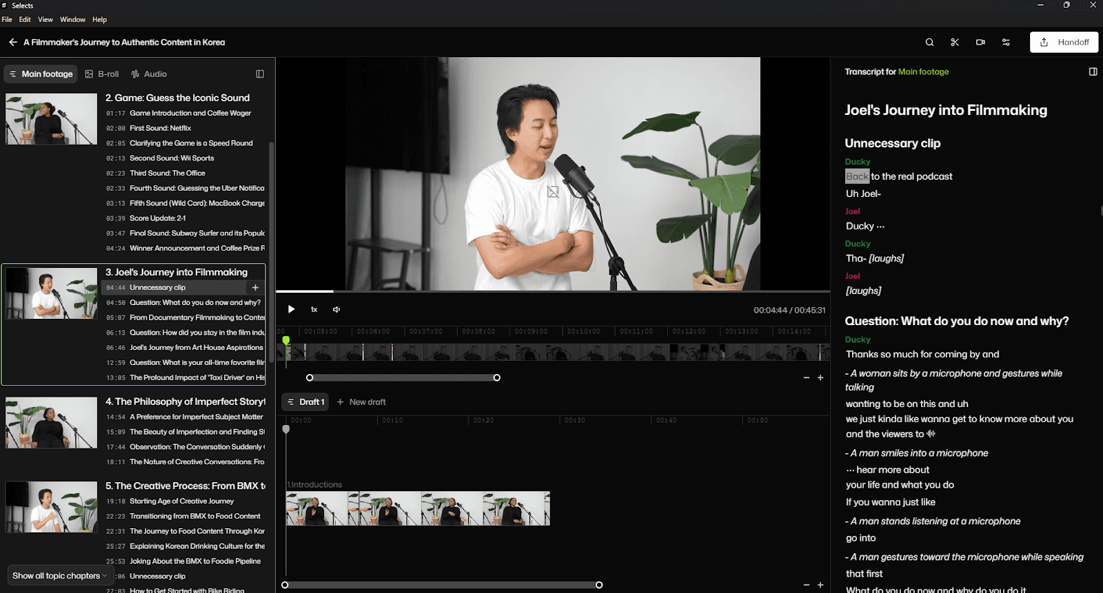 Automatic podcast editors like Selects can help standardize the prep work and save time, but they have to be used intentionally. Use them to take care of sync, cleanup, and initial organization, so you’re not starting from scratch each time you sit down with a new recording. When the material is prepped, you take over to address pacing or storytelling.