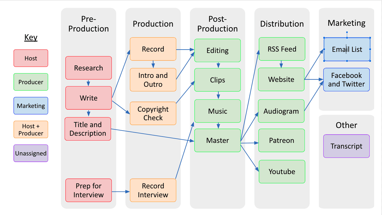 In a solo podcast, every role in this workflow belongs to one person.