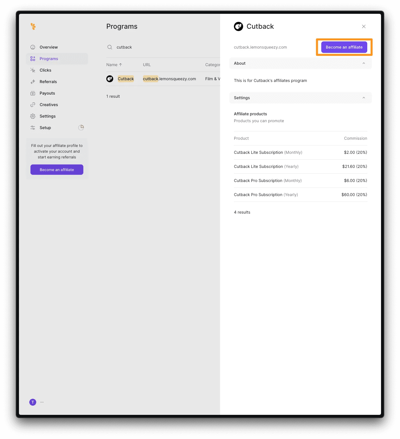 After the profile approval is finished by Lemon Squeezy, join the Cutback affiliate program. Click [View programs] and search for [Cutback]. Click [Become an affiliate].